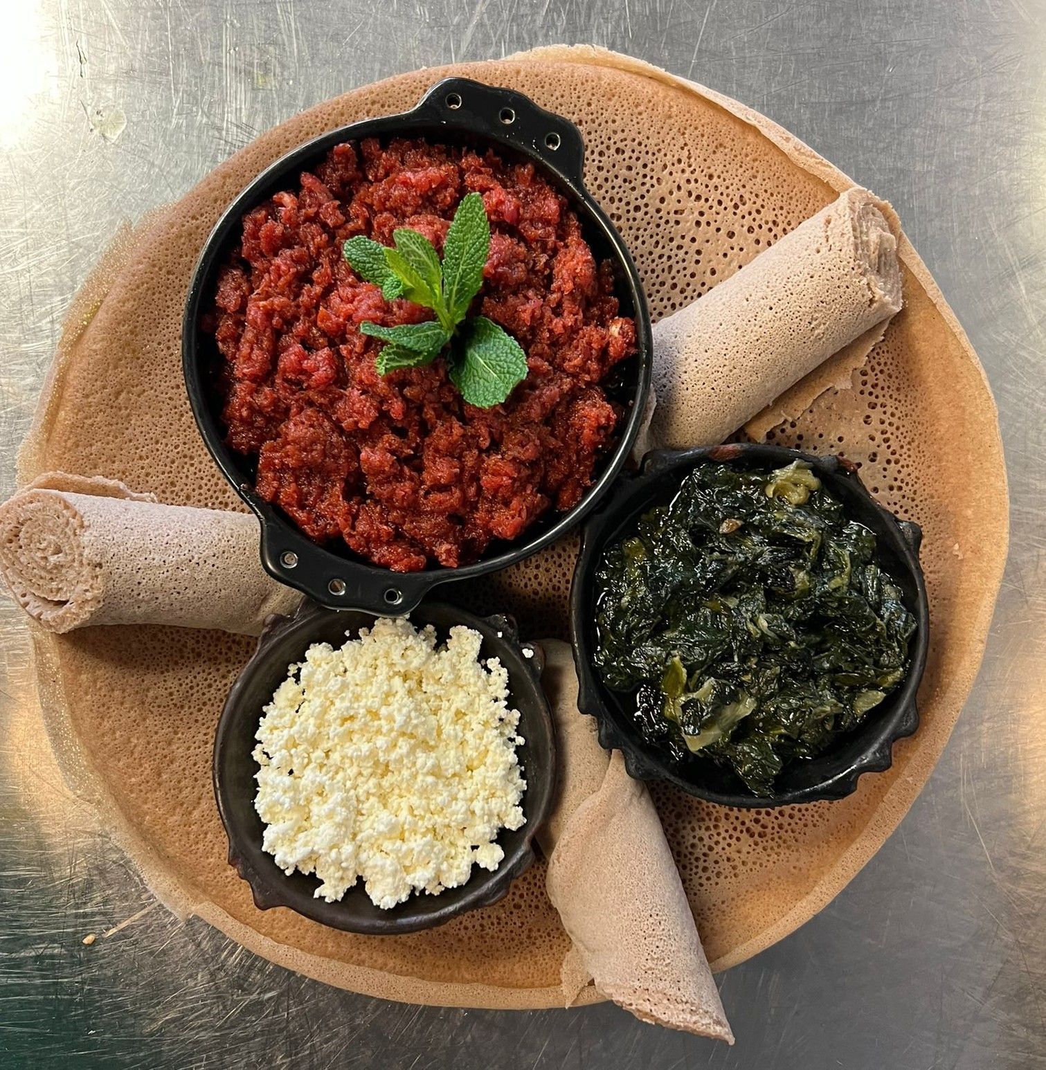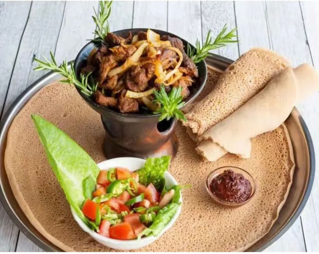Menus végétariens à base de pois chiches ou lentilles, de viandes d'agneau ou de boeuf préparées en sauce, sans oublier la traditionnelle galette injera, caractéristique de la cuisine éthiopienne et érythréenne: